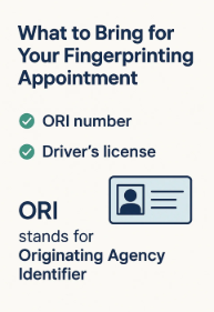 Your ORI # is a 9 digit code that identifies the employer or licensing agency requesting your background check. Please confirm the ORI number with the agency requesting your fingerprints as we do not take responsibility for the ORI # as these may change without notice.